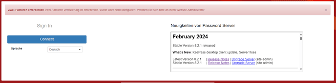 Prinzipiell sollte immer sichergestellt werden, dass zumindest der Administrator keinen oder einen anderen zweiten Faktor als die anderen User hat. Bitte erzwingen Sie den zweiten Faktor nicht, bevor er konfiguriert wurde. Wurde dies nicht beachtet kommt es bei der Anmeldung zu folgender Meldung:
