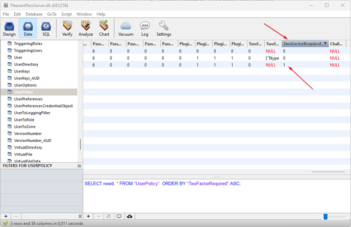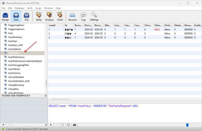 Nachdem die Datenbank geöffnet wurde, suchen Sie in der linken Spalte die Tabelle UserPolicy: