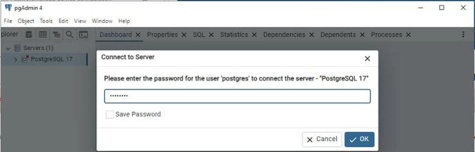 Starten Sie zunächst das Tool pg Admin 4. Dieses wurde mit PostgreSQL mit installiert und ist im Windows Startmenü zu finden. Wählen Sie nun Ihre Datenbank und authentifizieren sie sich daran.