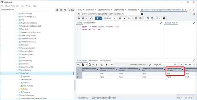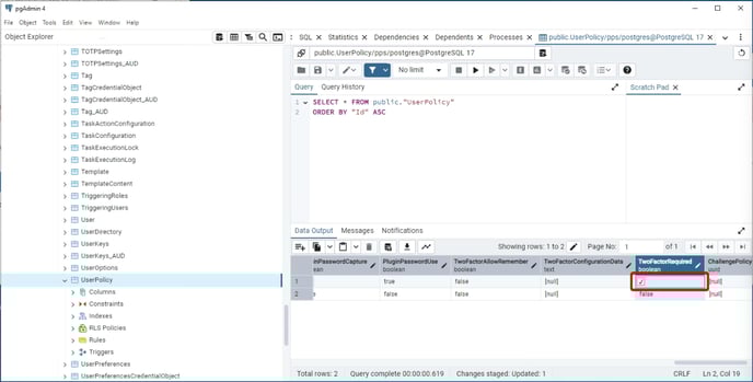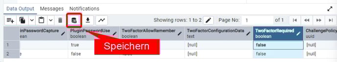 Nun klicken Sie mit rechts auf Schemas -> Tables -> UserPolicys und wählen View/Edit Data -> All Rows. Nun können Sie rechts unten im Fenster die Richtlinien bearbeiten. Scrollen Sie zunächst nach rechts bis zur Splate Name um festzustellen welche Richtlinie Sie bearbeiten wollen. Weiter rechts ist die Spalte TwoFactorRequired zu finden.