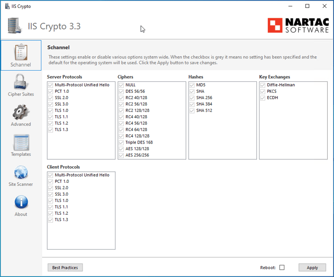 Zum Härten des Servers empfehlen wir das Tool IIS Crypto der Firma NARTAC. Laden Sie das Tool zunächst herunter und starten es.