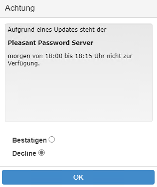 Manchmal kann es sinnvoll sein, beim Start des Pleasant Password Servers Hinweise einzublenden. Beispielsweise um eine Downtime für ein Update anzukündigen.
