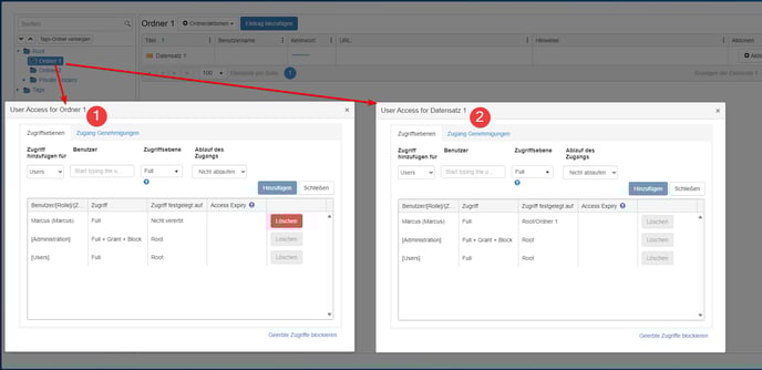 Ordner sind in einer hierarchischen Struktur angeordnet und dienen der Organisation von Datensätzen. Jeder Ordner verfügt über spezifische Berechtigungen, die entweder von einem übergeordneten Ordner vererbt oder direkt am jeweiligen Ordner festgelegt werden können. Diese Flexibilität ermöglicht eine gezielte Verwaltung der Zugriffsrechte auf die enthaltenen Datensätze.