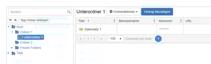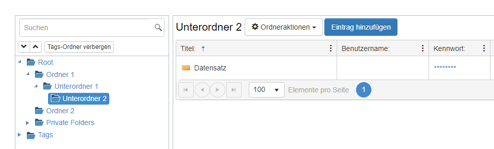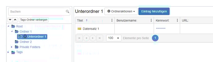 In den Datensätzen werden Ihre Zugangsdaten, wie beispielsweise Benutzername und Passwort, sicher gespeichert. Sowohl Benutzer als auch Rollen können Berechtigungen für diese Datensätze erhalten. Zudem haben die Datensätze die Möglichkeit, die Zugriffsrechte der übergeordneten Ordner zu erben, in denen sie abgelegt sind.