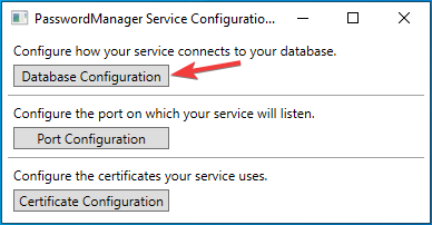 Öffnen Sie zunächst über das Windows Startmenü das Tool Service Configuration. Hier öffnen Sie dann die Database Configuration:
